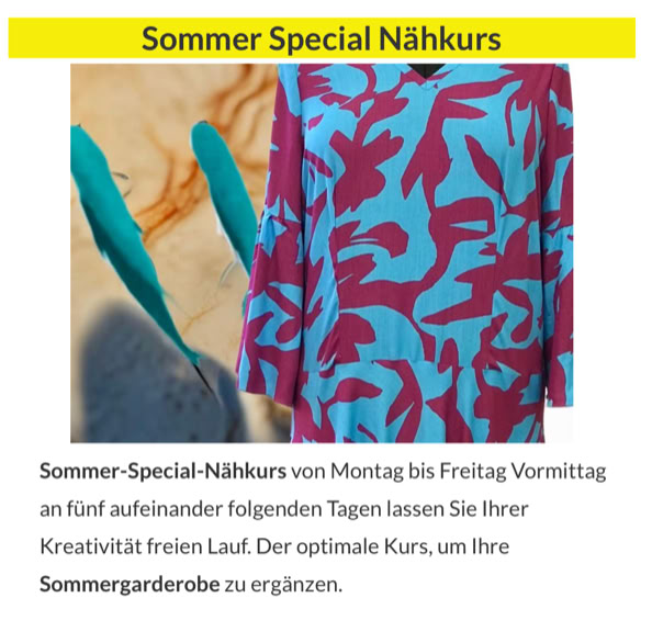 Sommer-Special-Nähkurs von Montag bis Freitag vormittags. An fünf aufeinander folgenden Tagen lassen Sie Ihrer Kreativität freien Lauf. Der optimale Kurs, um Ihre Sommergarderobe zu ergänzen.