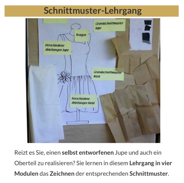 Reizt es Sie, einen selbst entworfenen Jupe und auch ein Oberteil zu realisieren? Sie lernen in diesem Lehrgang in vier Modulen das Zeichnen der entsprechenden Schnittmuster.